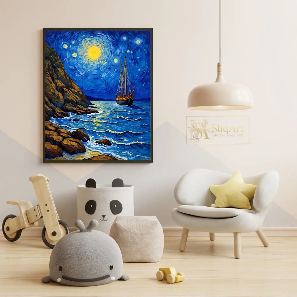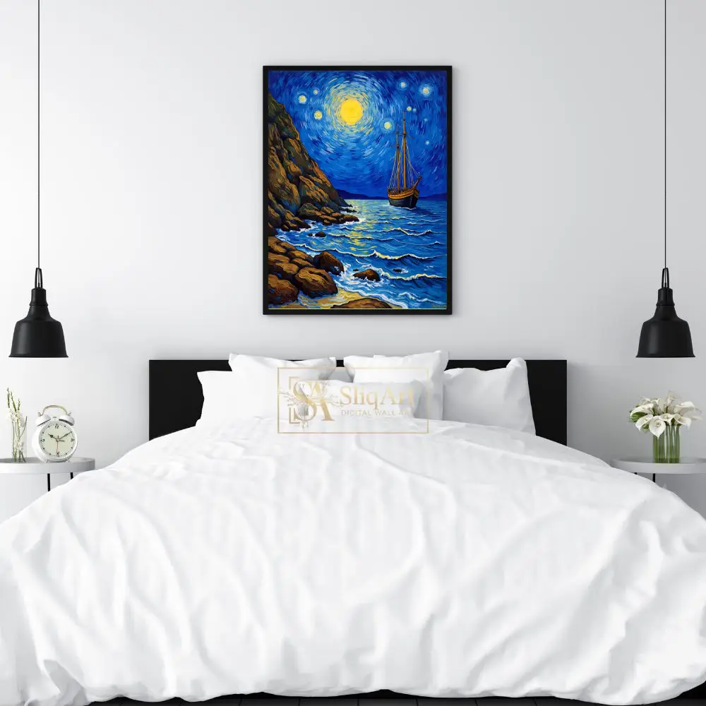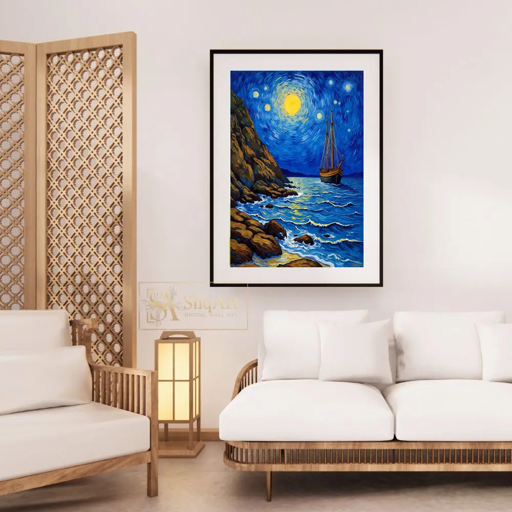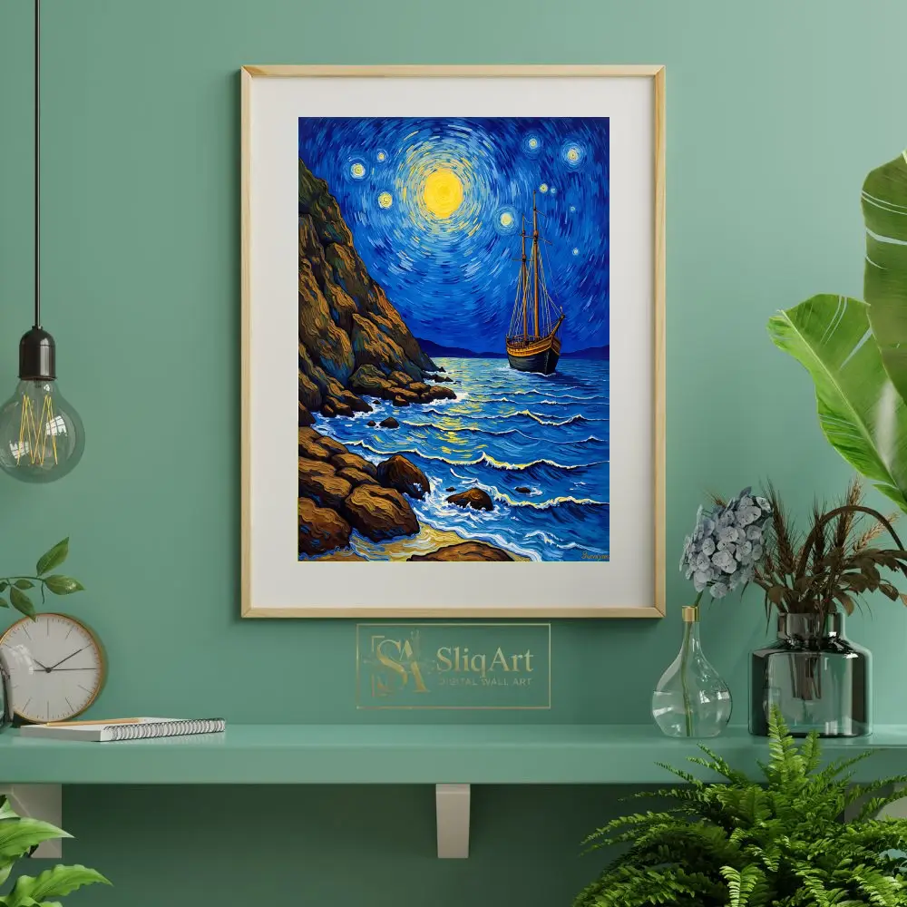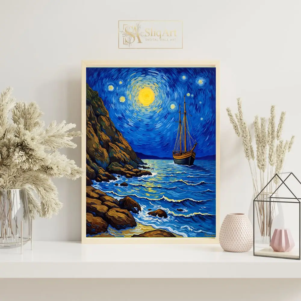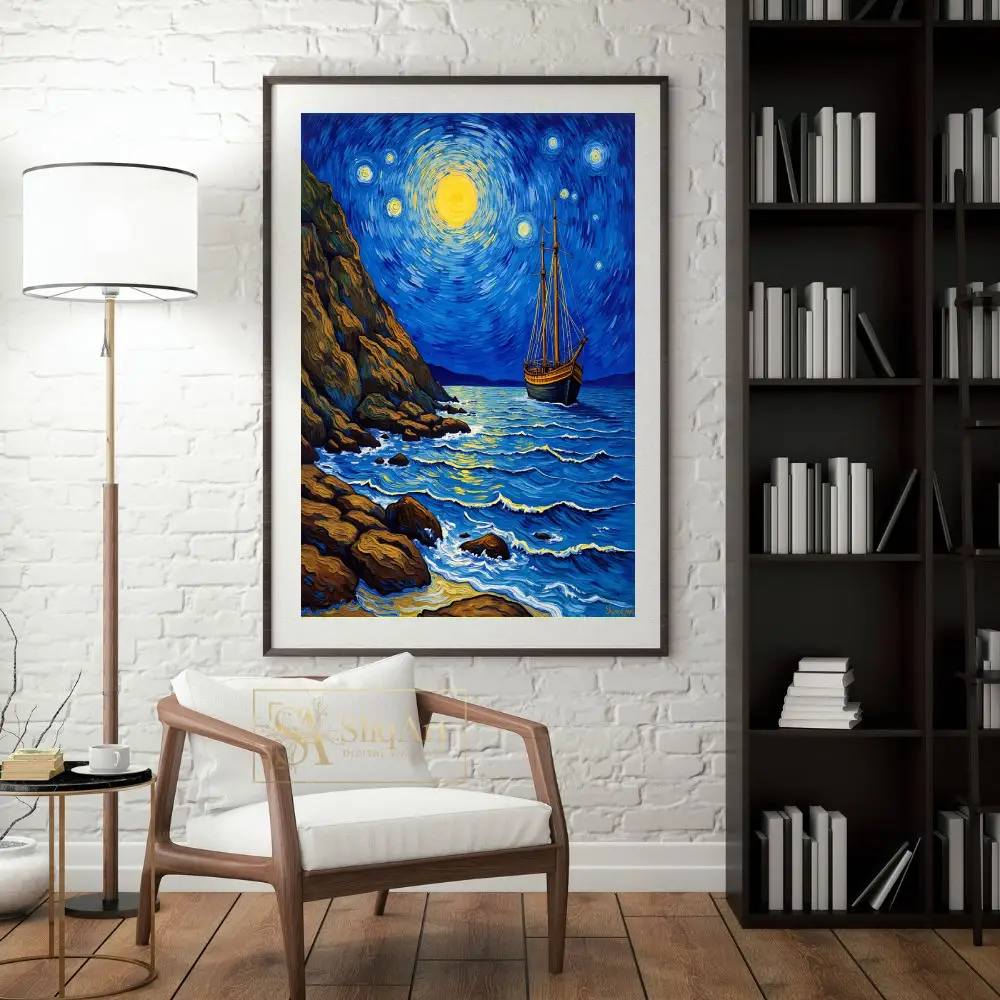 Embrace the spirit of a legendary masterpiece with this stunning Post-Impressionist seascape. Inspired by the expressive brushwork of Vincent van Gogh, ‘Celestial Voyage’ depicts a lone sailing vessel navigating deep indigo waters beneath a swirling, luminous sky.