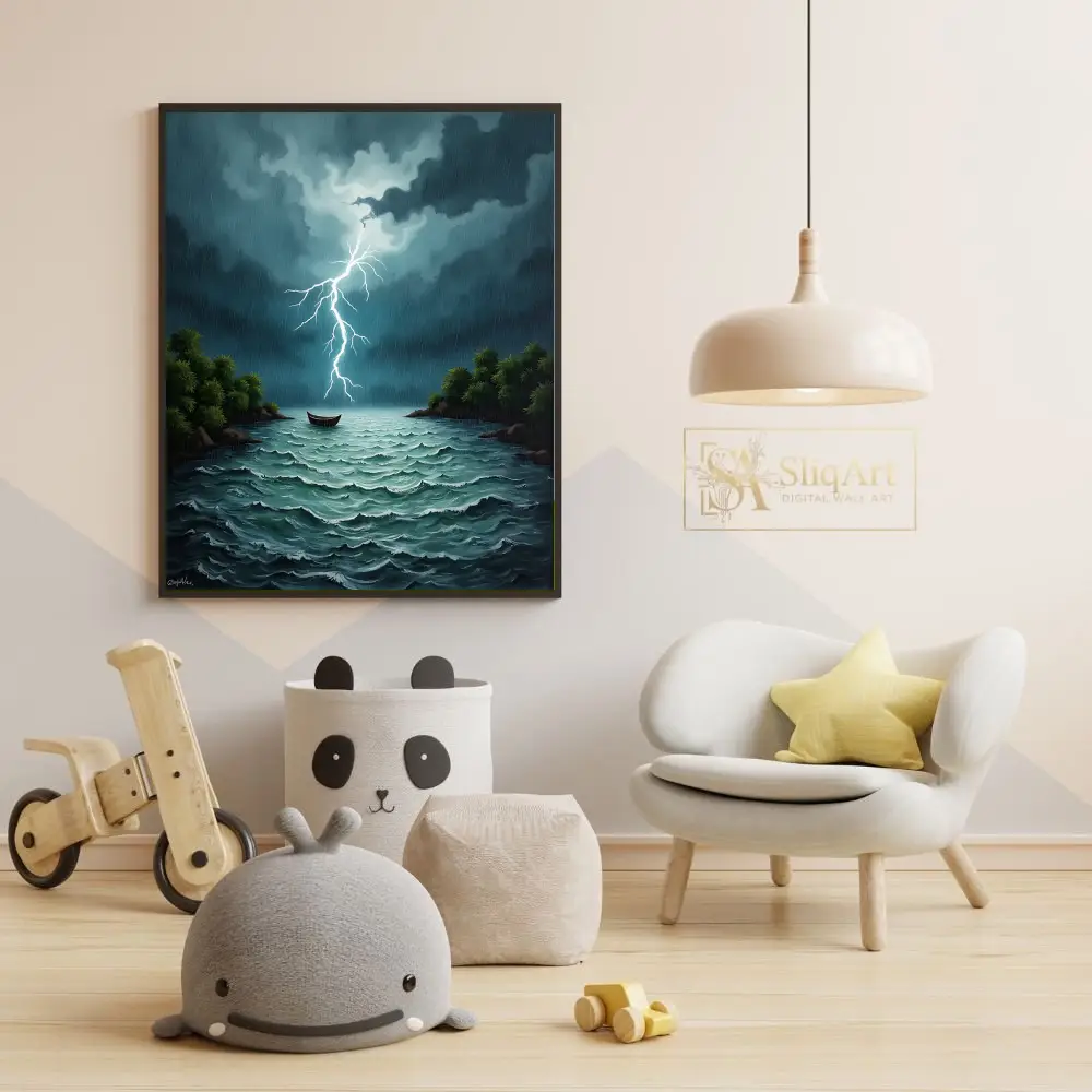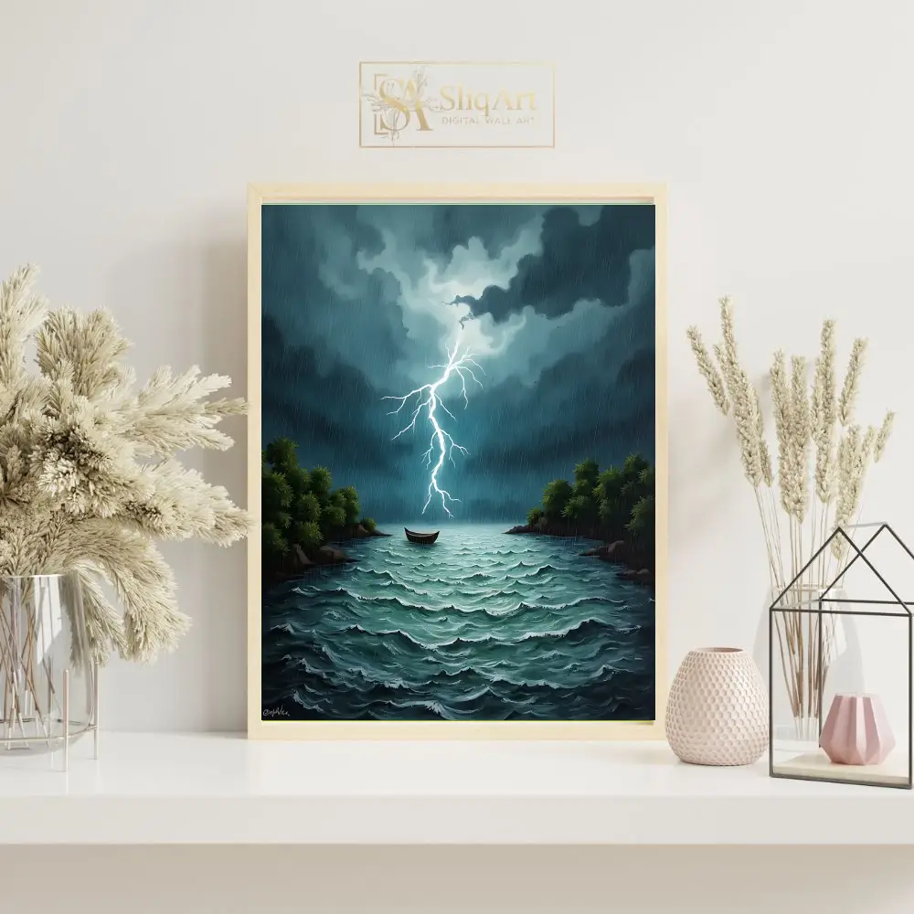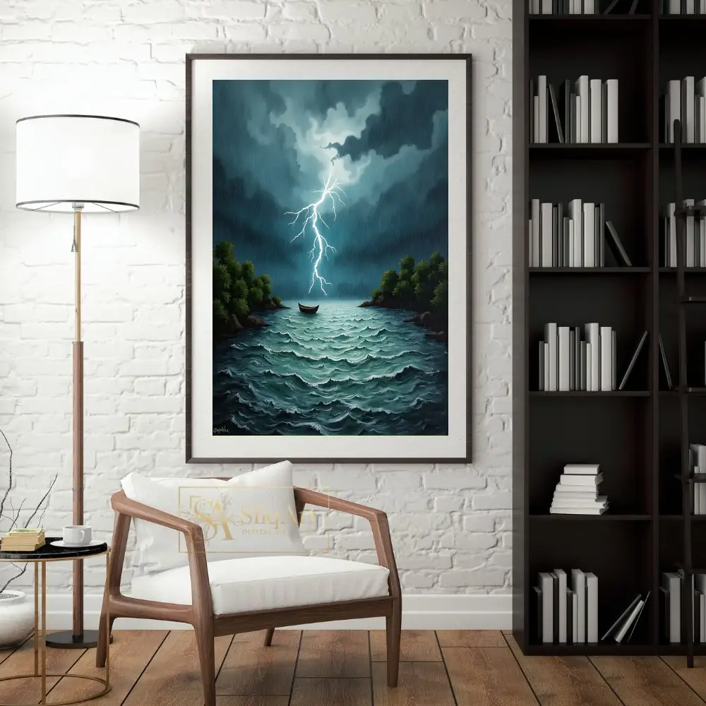 A brilliant, jagged lightning bolt pierces through the heavy, charcoal-grey clouds, illuminating the rain-streaked sky and the whitecaps of the choppy waves. Surrounded by dark, rocky islands topped with lush greenery, this piece evokes a sense of awe and the sublime. Perfect for those who find beauty in the intensity of the elements, this canvas brings a dynamic and atmospheric energy to any modern space.