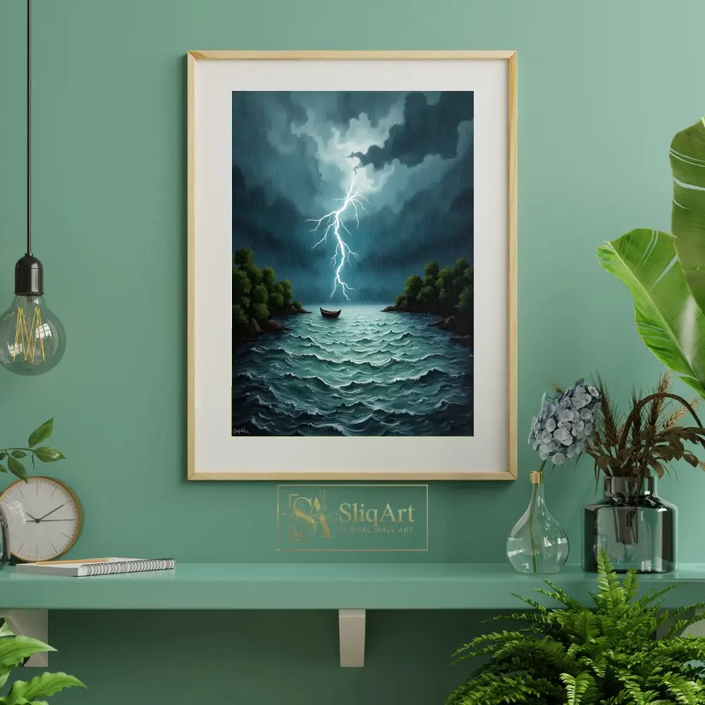 A powerful digital painting featuring a lightning bolt striking over a stormy emerald sea with a lonely boat and dark, atmospheric clouds.