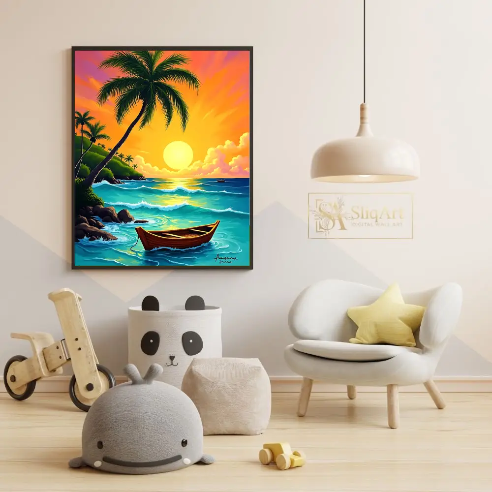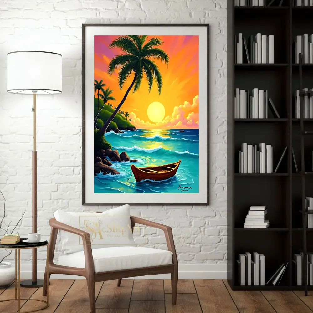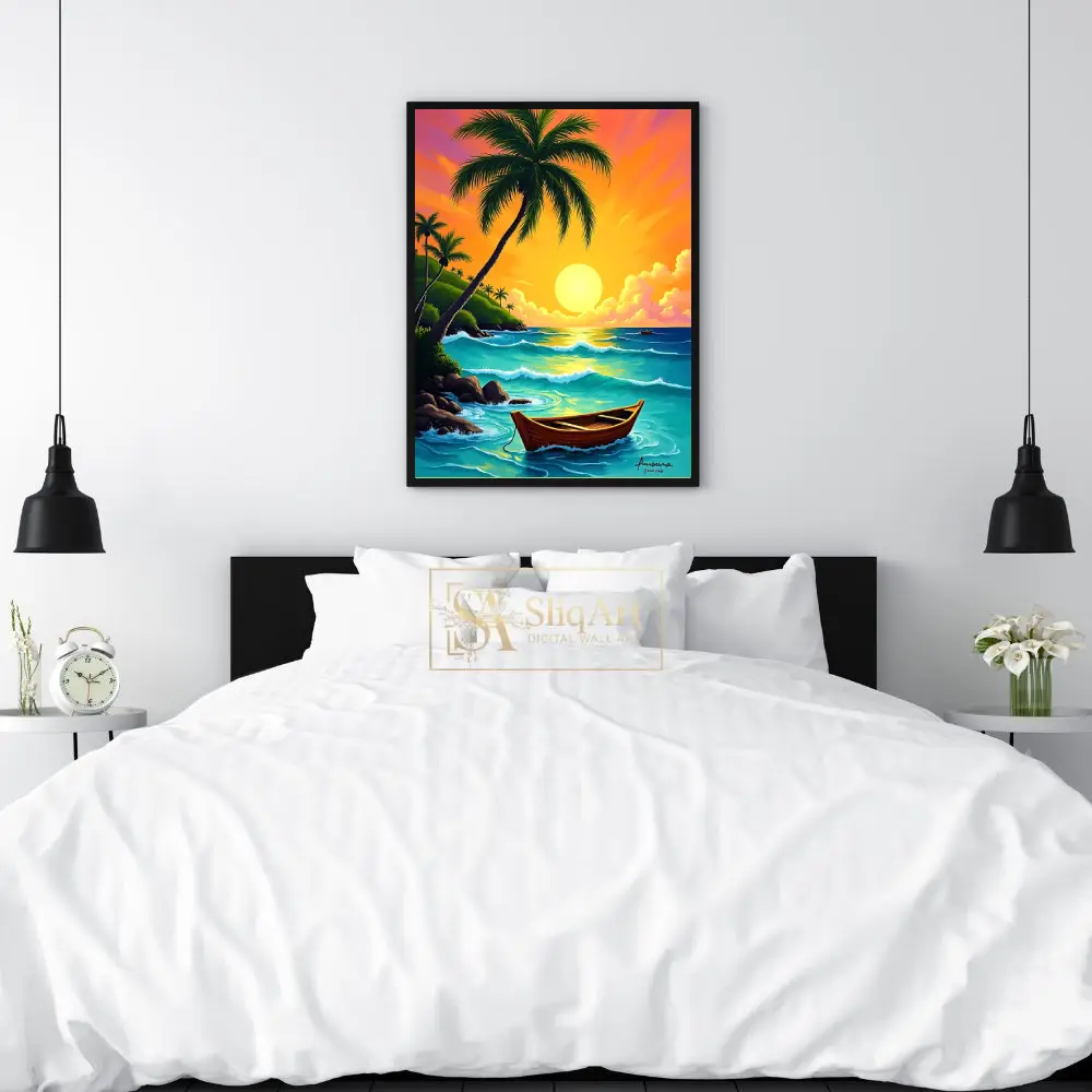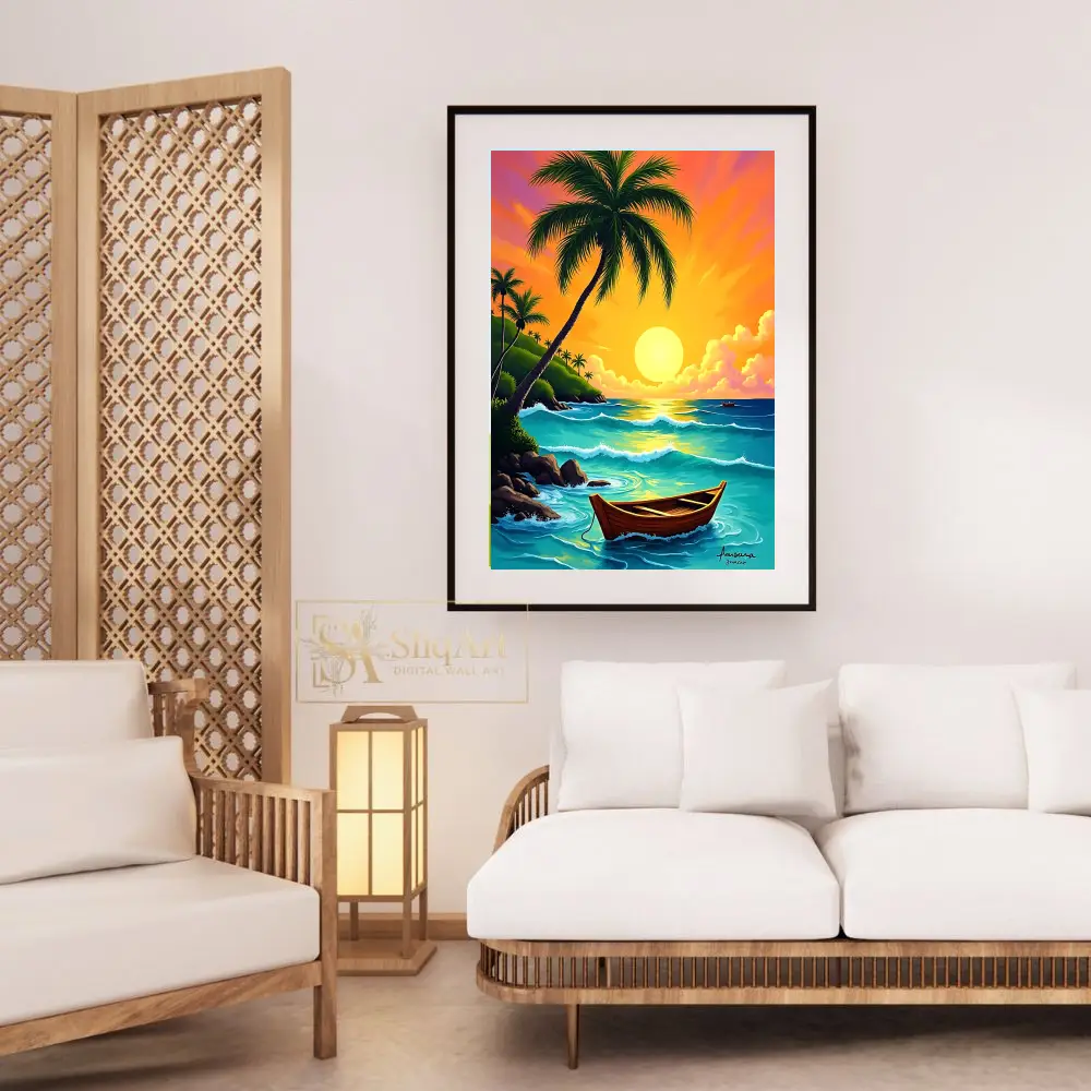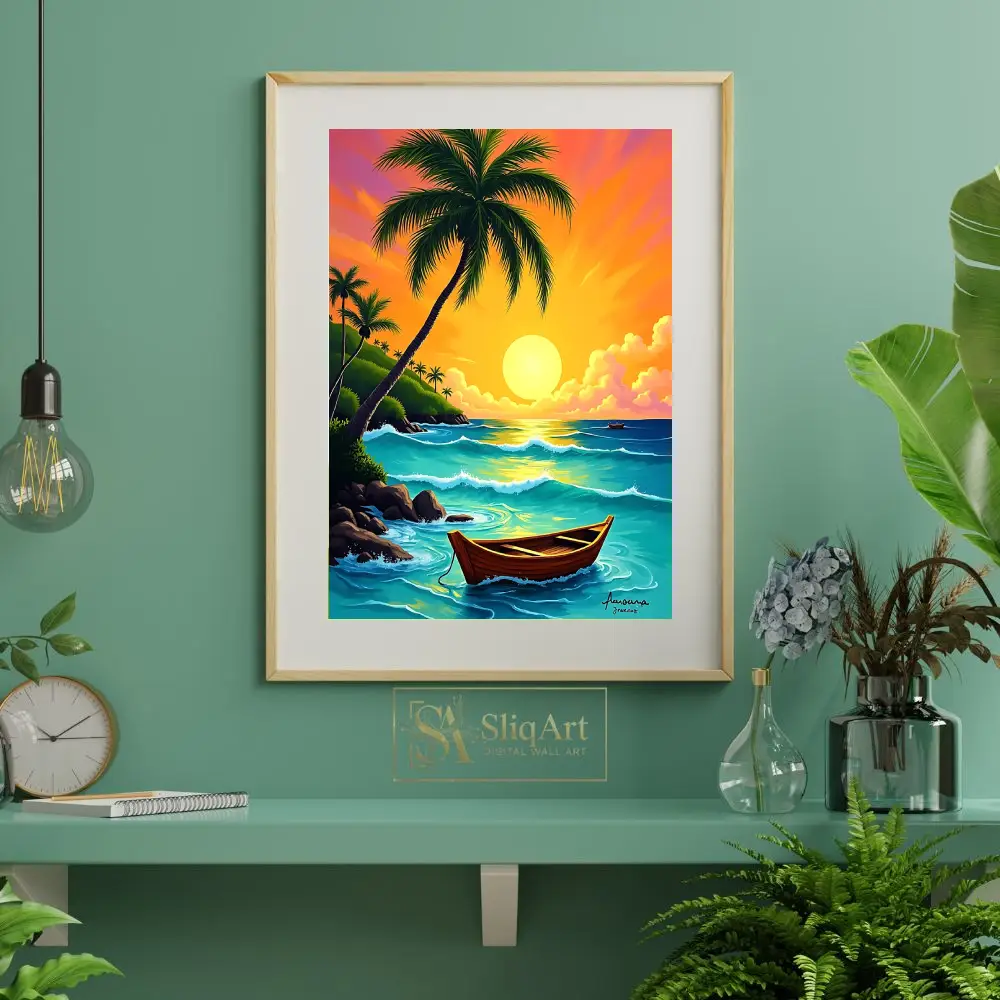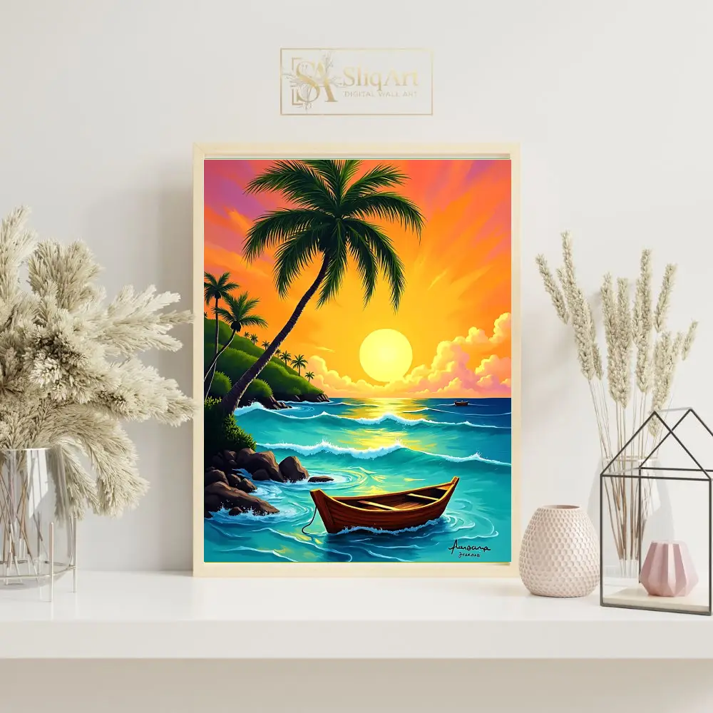 A traditional wooden boat rests peacefully on the water, while lush palm trees and rocky cliffs frame the serene bay. This high-energy yet calming digital art piece captures the essence of a perfect island escape, bringing warmth and a sense of wanderlust into your living space.