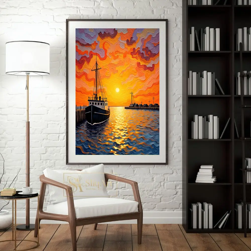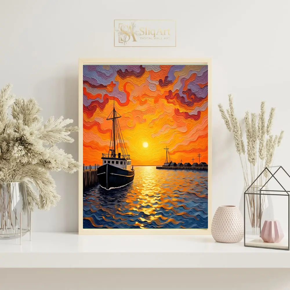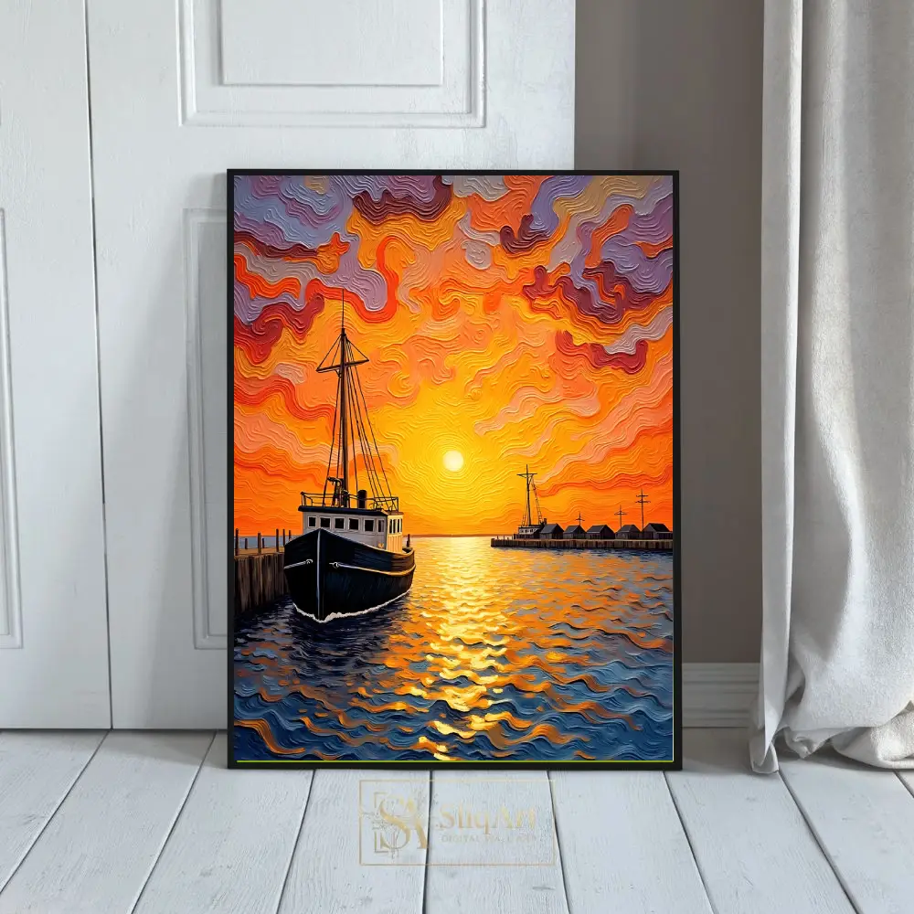 The composition centers on a sturdy fishing vessel moored against a wooden pier, bathed in the golden glow of a descending sun. The sky is a whirlpool of fiery oranges, radiant yellows, and soft purples, which are perfectly mirrored in the undulating blue waves below. This piece is more than just decor; it is a window into a moment of maritime tranquility and natural wonder that transforms any room into a coastal escape.
