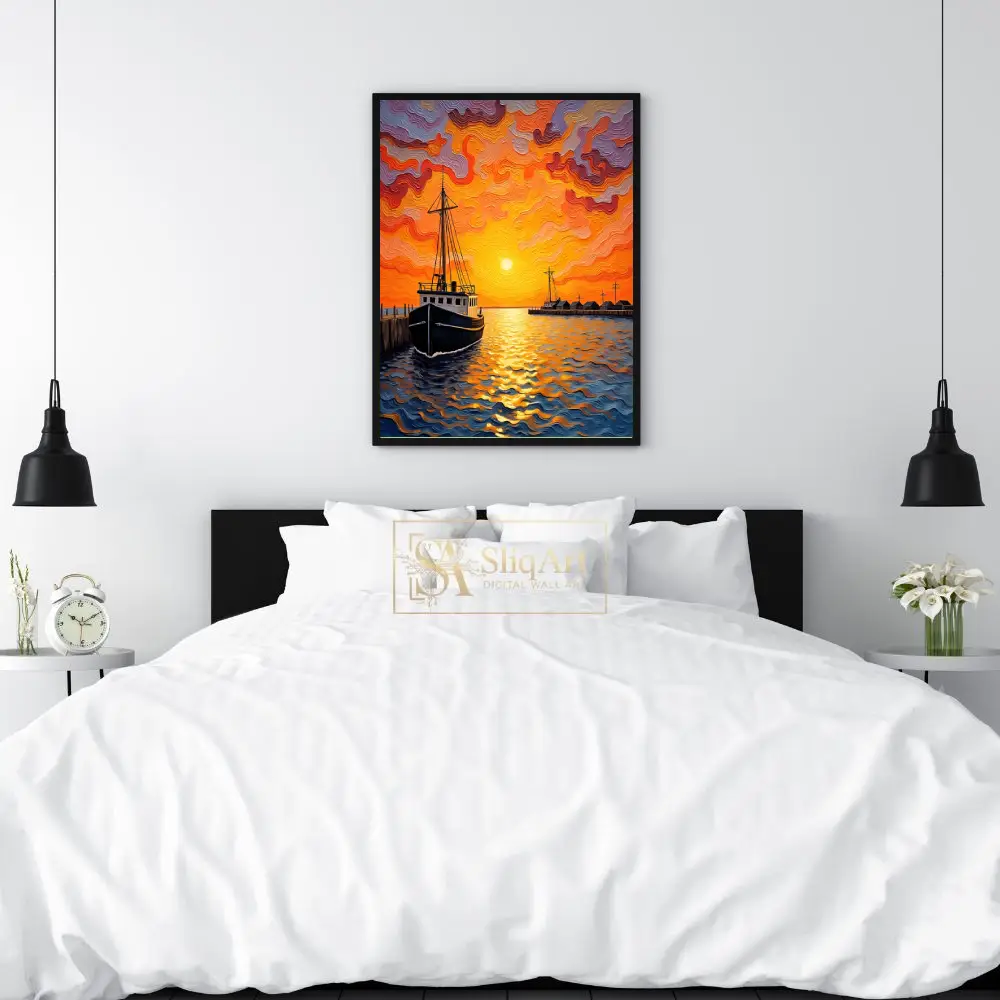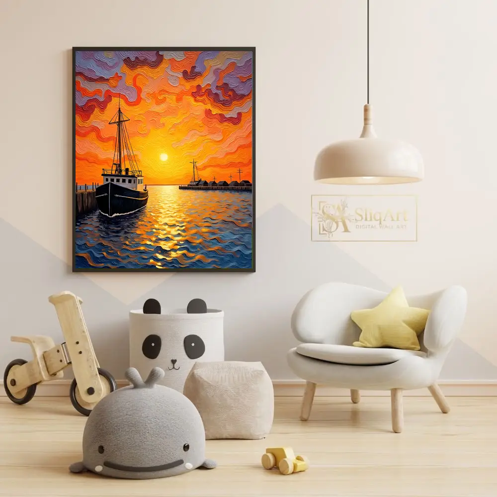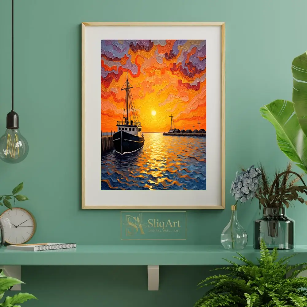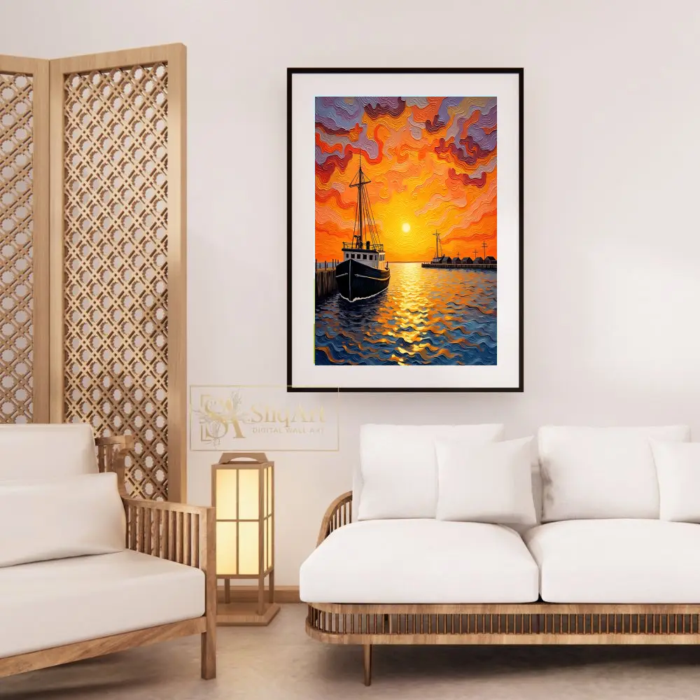 The composition centers on a sturdy fishing vessel moored against a wooden pier, bathed in the golden glow of a descending sun. The sky is a whirlpool of fiery oranges, radiant yellows, and soft purples, which are perfectly mirrored in the undulating blue waves below. This piece is more than just decor; it is a window into a moment of maritime tranquility and natural wonder that transforms any room into a coastal escape.