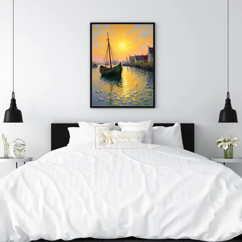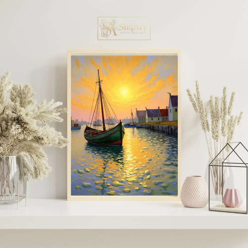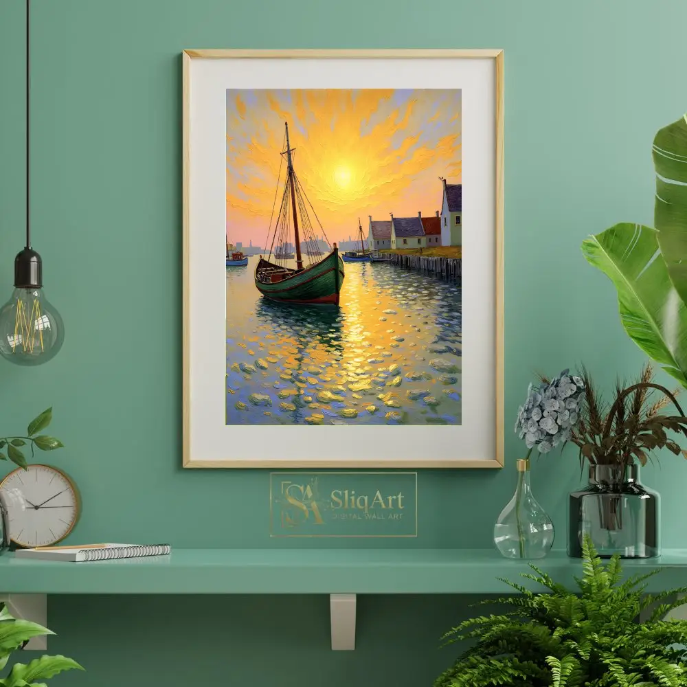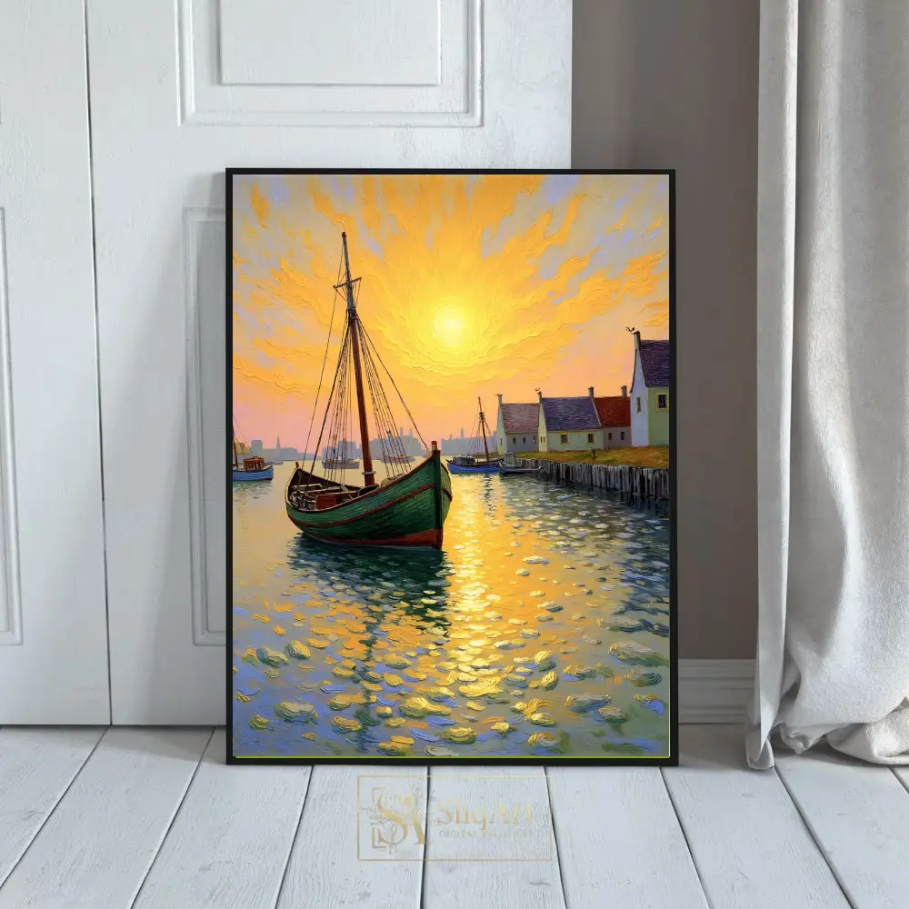 Capture the radiant energy of a coastal sunset with this stunning impressionist-style canvas art. The piece features a green fishing boat anchored in a peaceful harbor, rendered with thick, expressive impasto brushstrokes that create a sense of movement and texture.