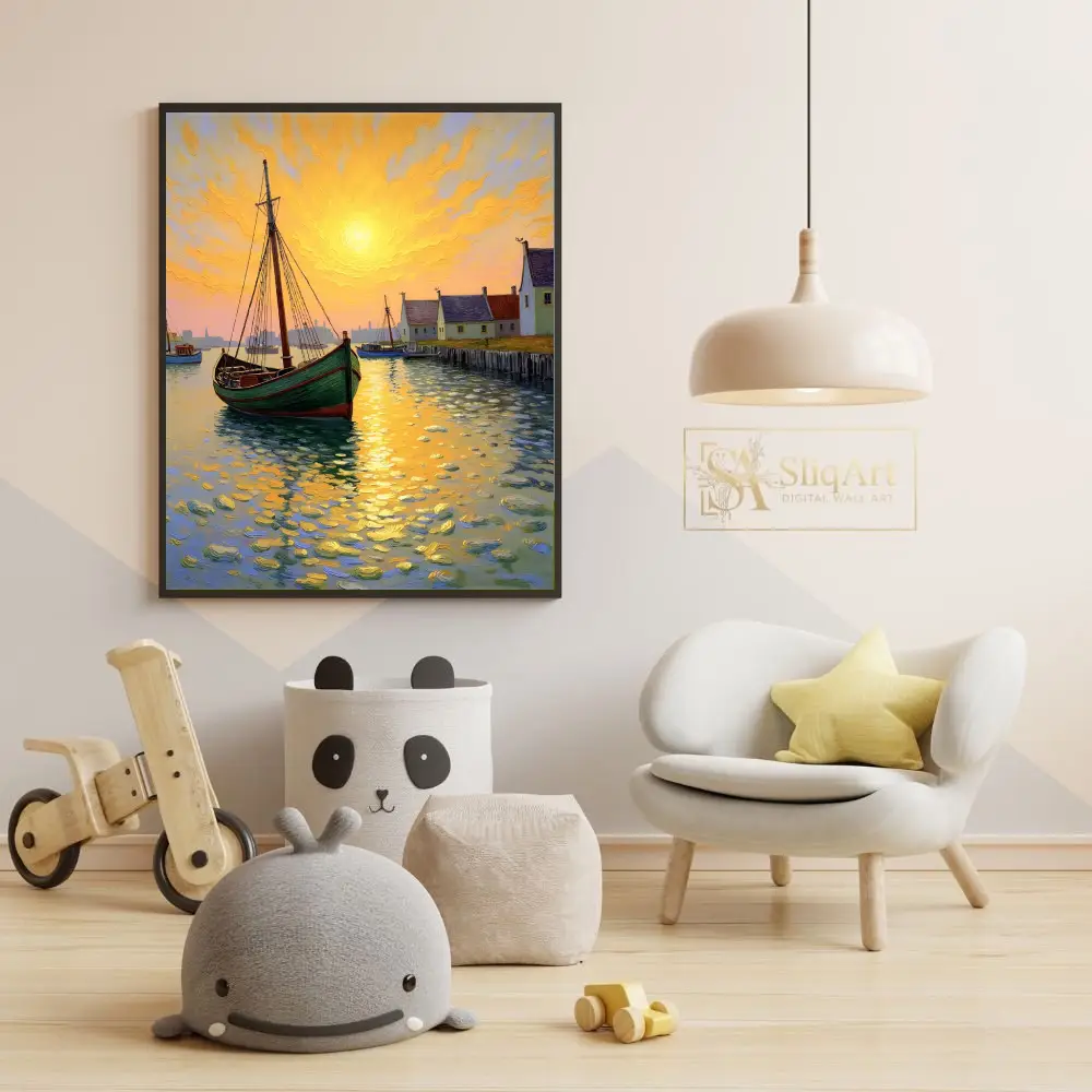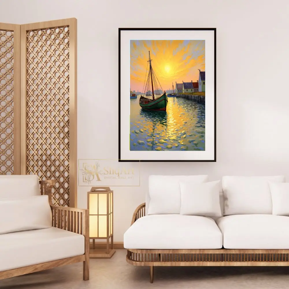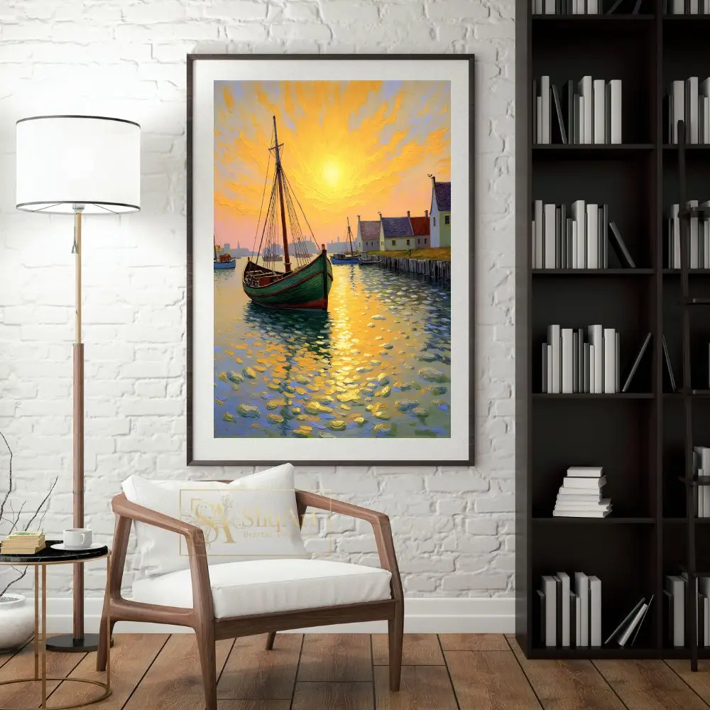 The sky is a masterpiece of golden yellows and oranges, echoing the sun’s reflection on the dappled water, while a quaint village lines the distant shore. This artwork brings a sense of warmth and artistic flair to any modern or traditional home.