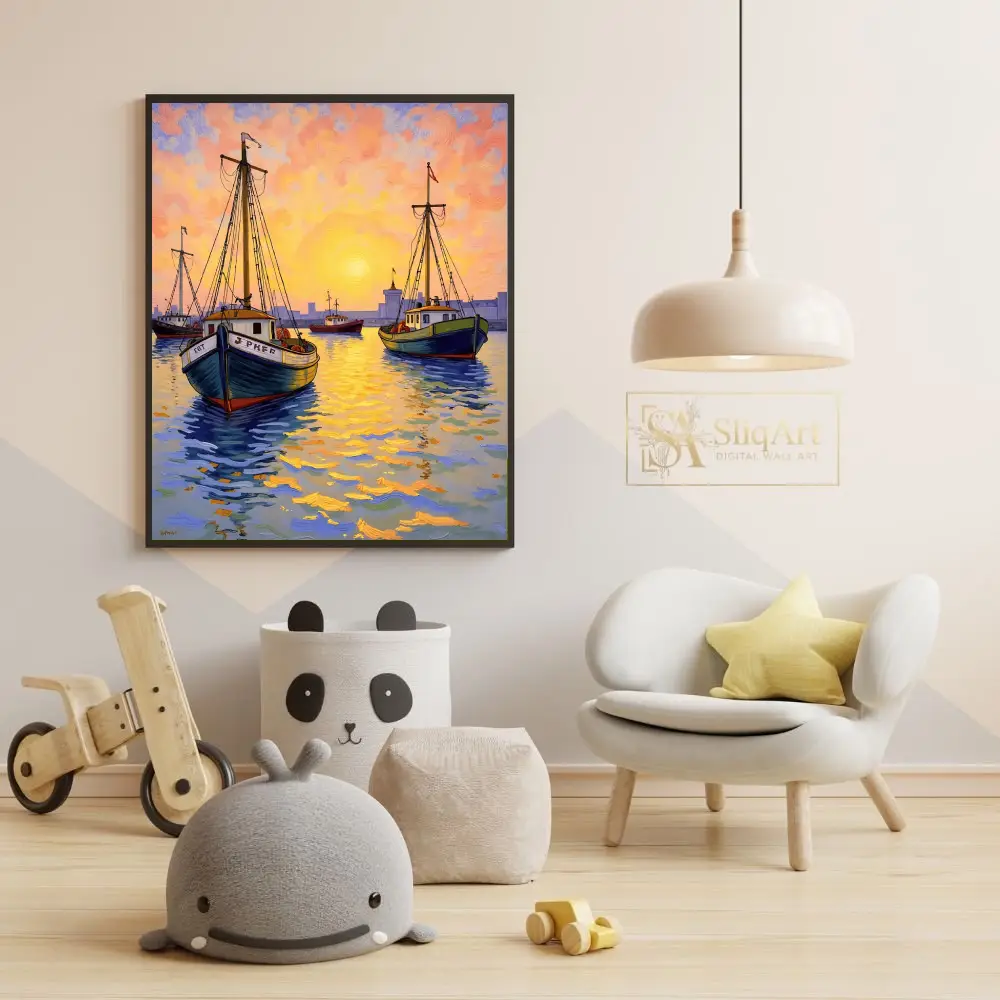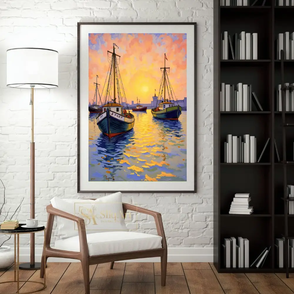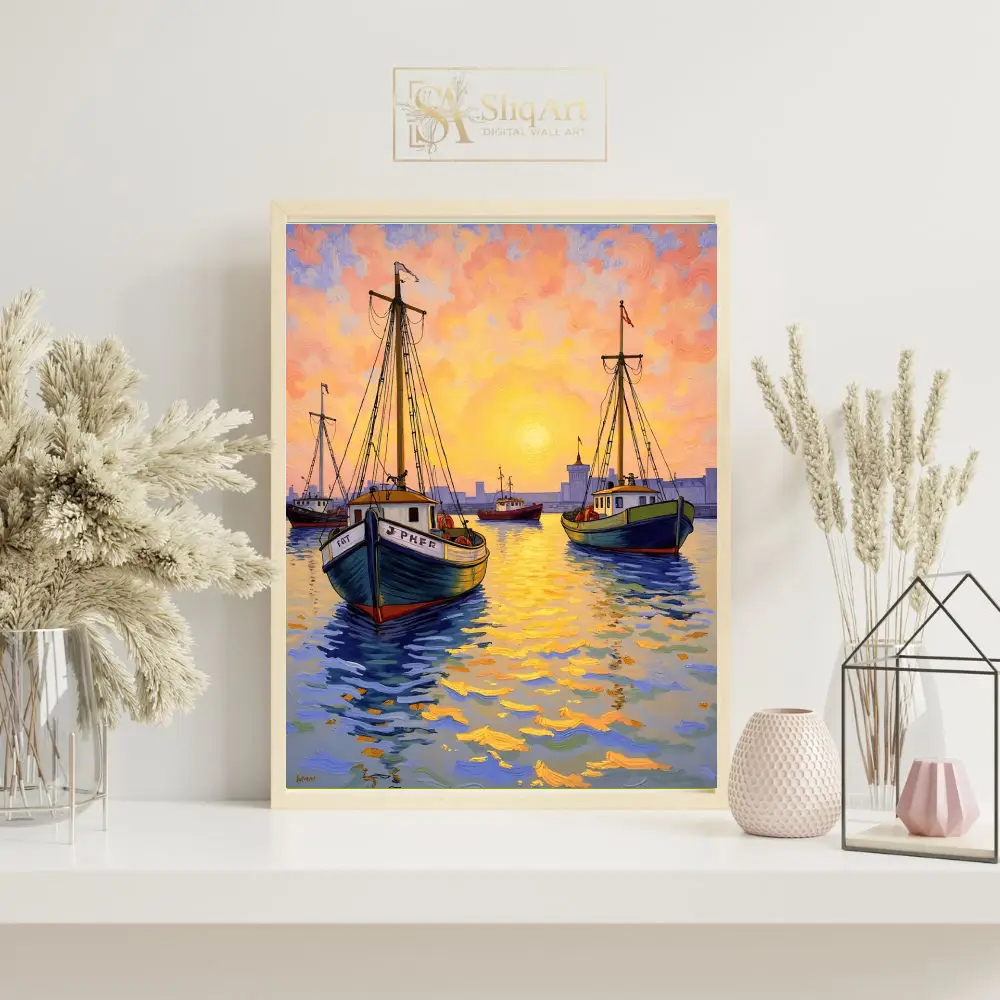 Capturing the serene yet vibrant atmosphere of a harbor at sunset, this impressionist-style digital painting features a fleet of fishing boats resting on shimmering waters. The sky is a masterpiece of swirling peach, pink, and golden hues, echoing the textured, impasto brushwork of classical masters.