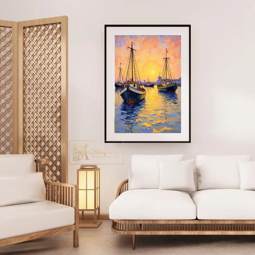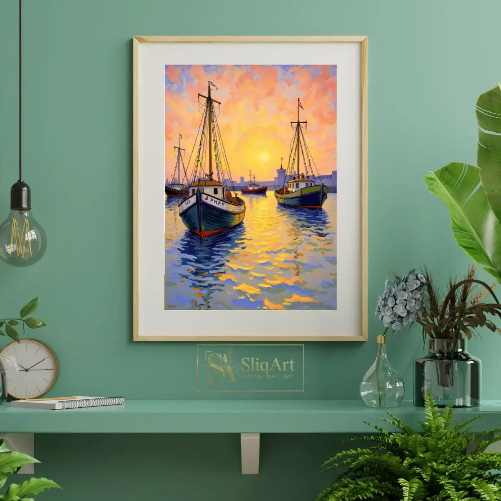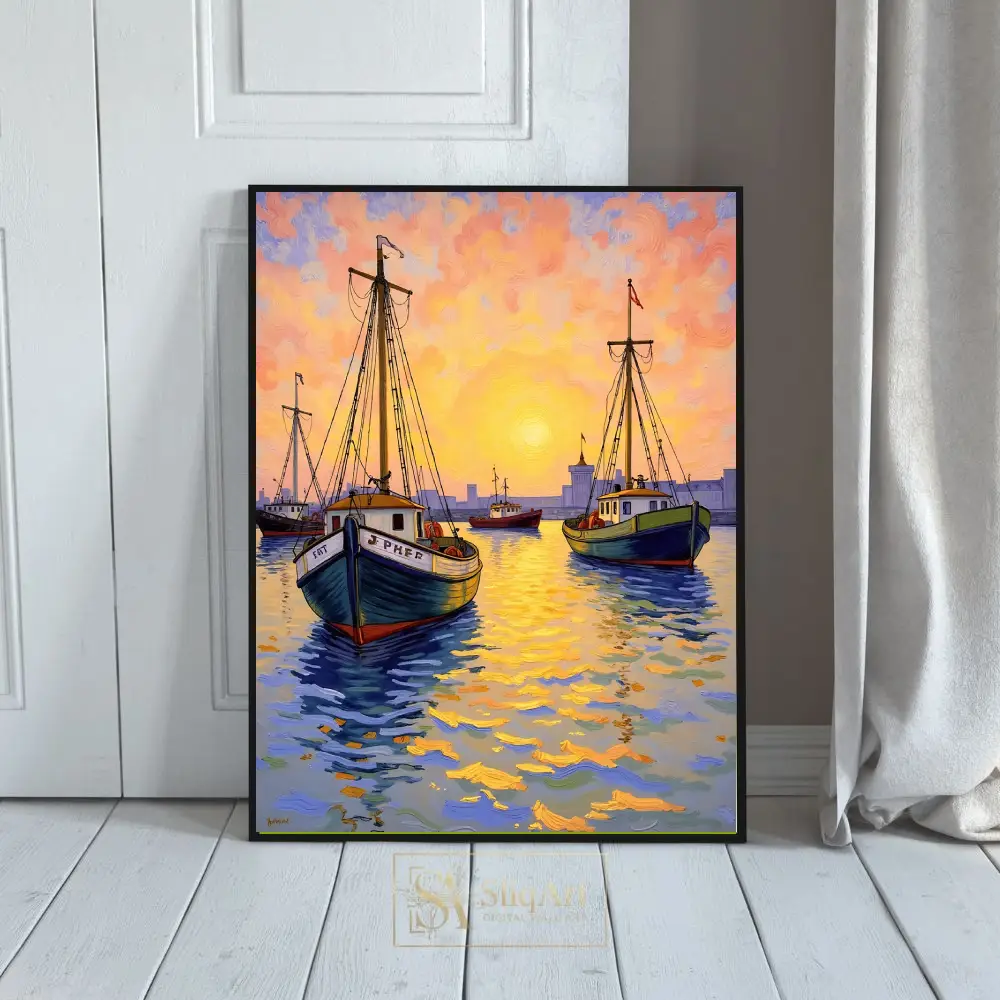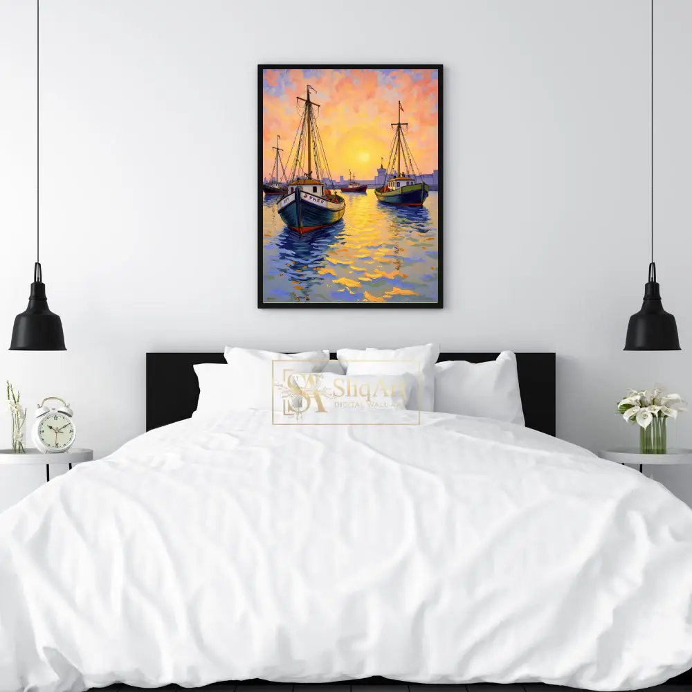 Capturing the serene yet vibrant atmosphere of a harbor at sunset, this impressionist-style digital painting features a fleet of fishing boats resting on shimmering waters. The sky is a masterpiece of swirling peach, pink, and golden hues, echoing the textured, impasto brushwork of classical masters.