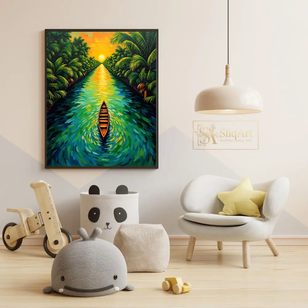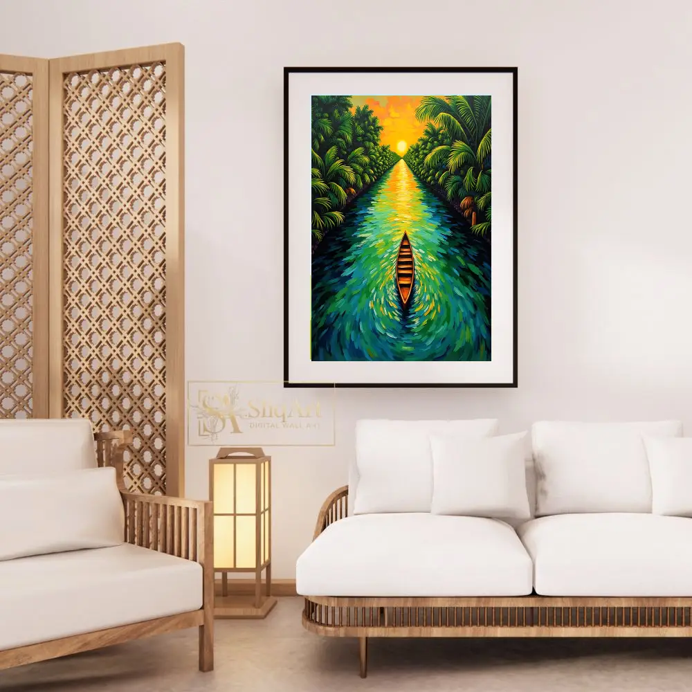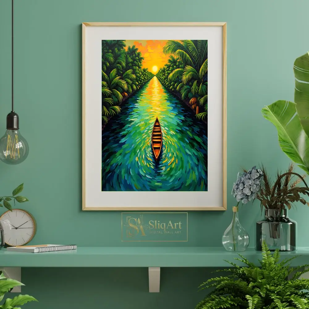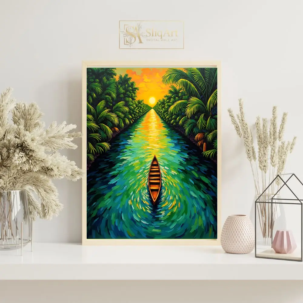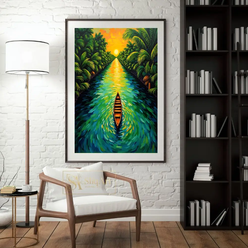 Experience the serene beauty of a tropical paradise with ‘Golden Horizon.’ This stunning artwork captures a solitary wooden boat gliding down a tranquil river at sunset, flanked by lush, emerald palm trees. The vibrant color palette features a glowing golden sun reflected in the textured, swirling waters of teal and deep blue.