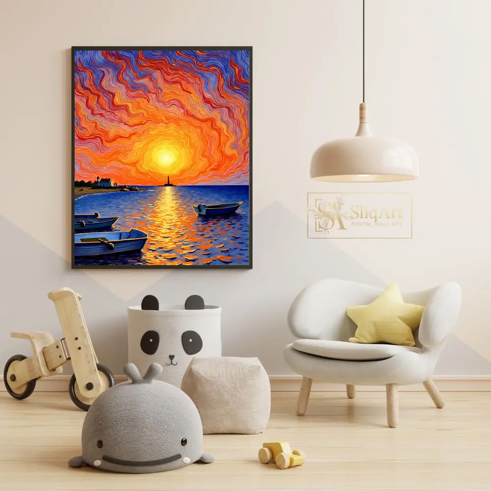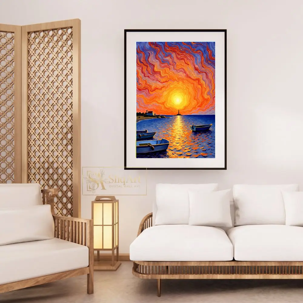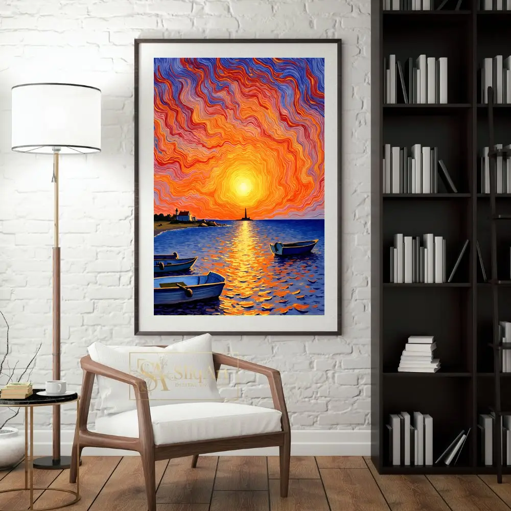 Experience the captivating energy of a coastal sunset through this stunning post-impressionist masterpiece. Inspired by the expressive brushwork of Van Gogh, the sky erupts in a hypnotic swirl of fiery oranges, golden yellows, and deep reds, radiating from a central sun.