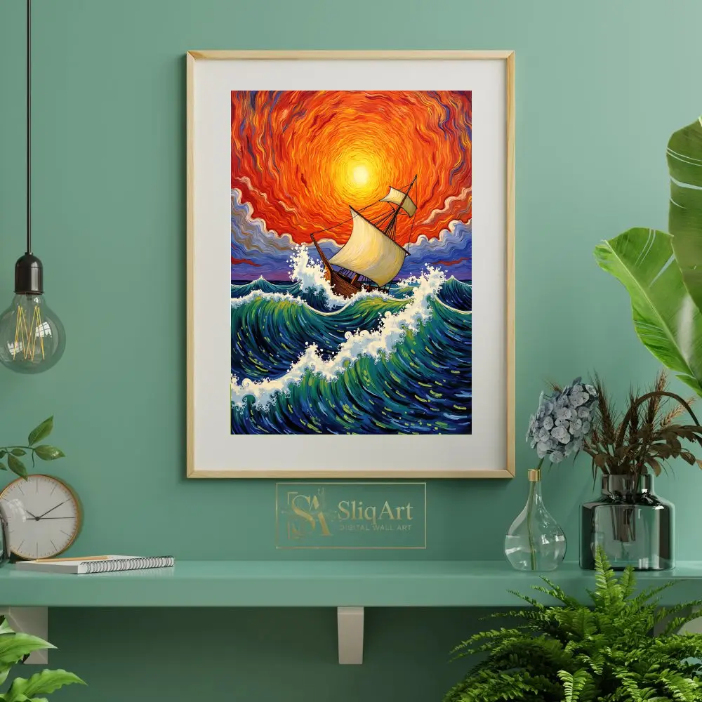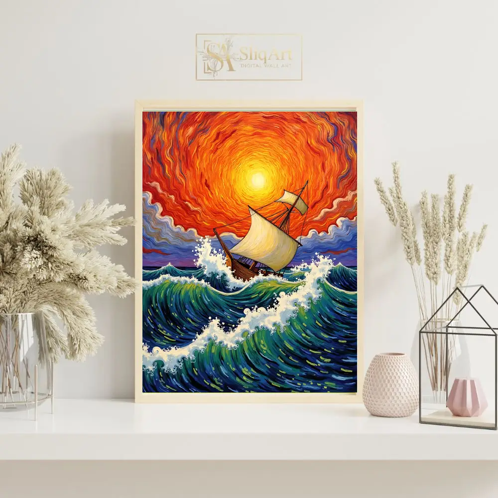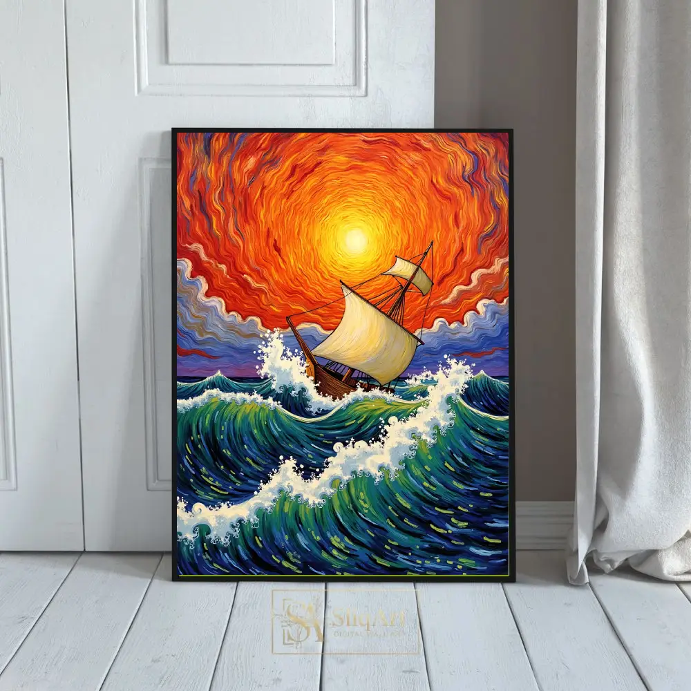 Experience the raw energy of the ocean with this breathtaking expressionist painting. Featuring a majestic wooden sailing ship navigating turbulent, cresting waves, this piece is defined by its swirling, fiery sunset sky.