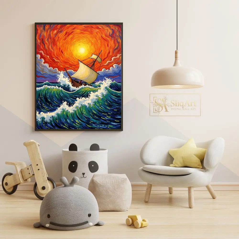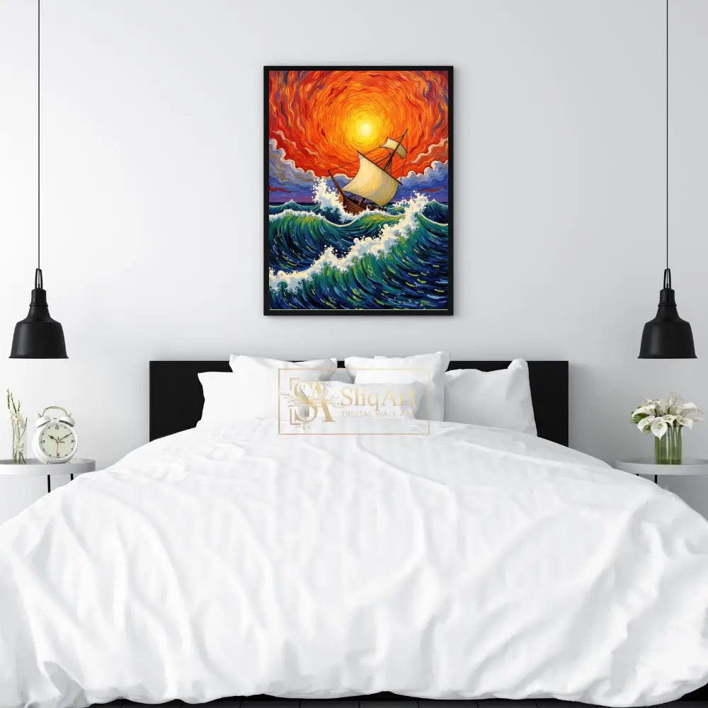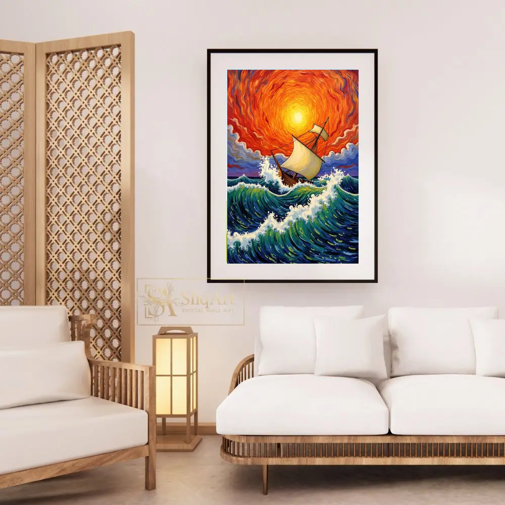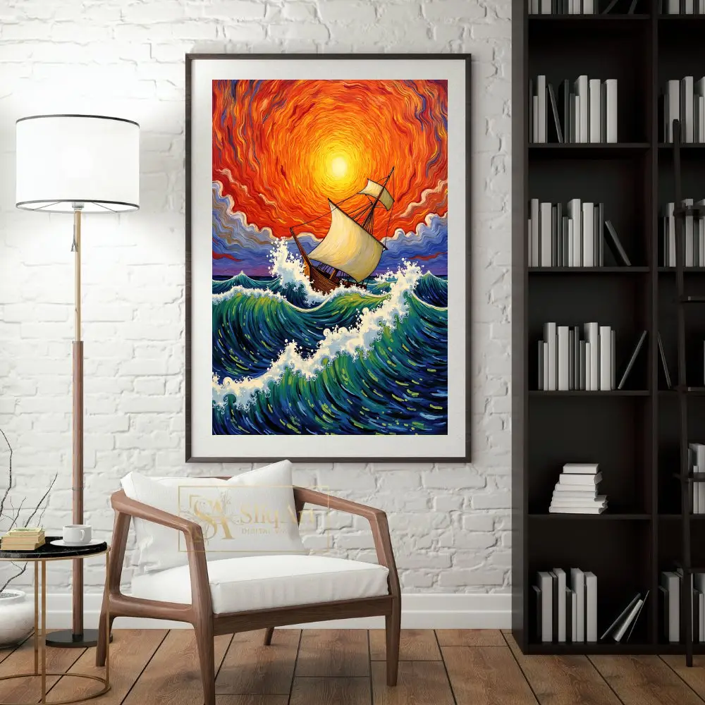 Experience the raw energy of the ocean with this breathtaking expressionist painting. Featuring a majestic wooden sailing ship navigating turbulent, cresting waves, this piece is defined by its swirling, fiery sunset sky.