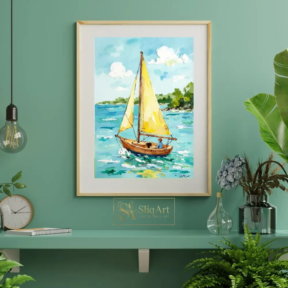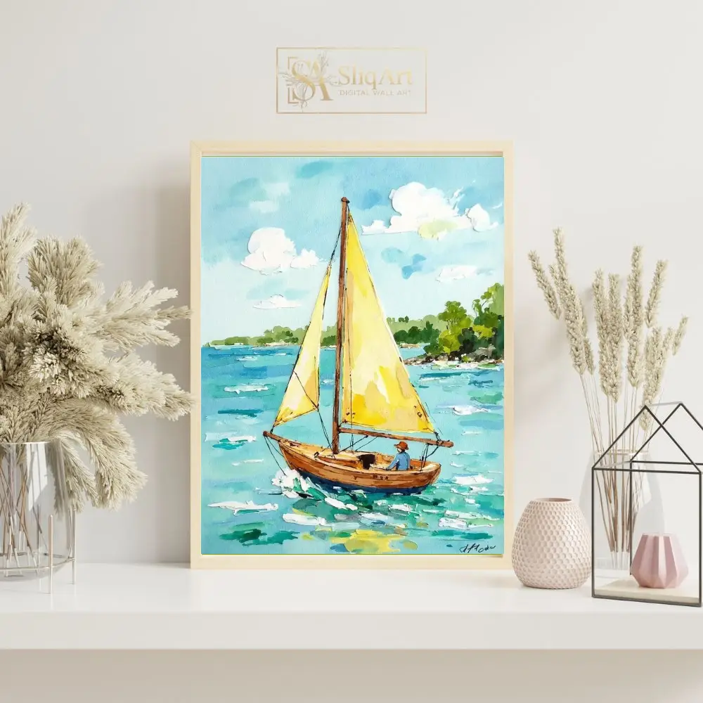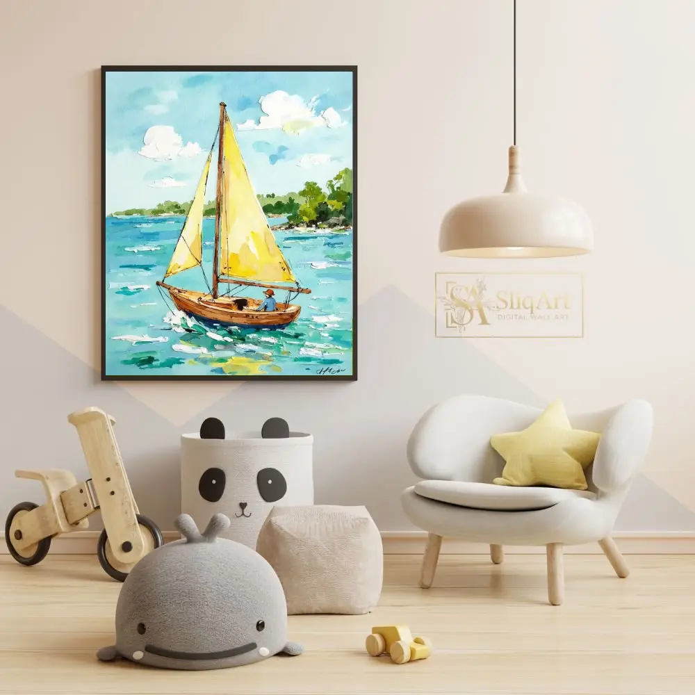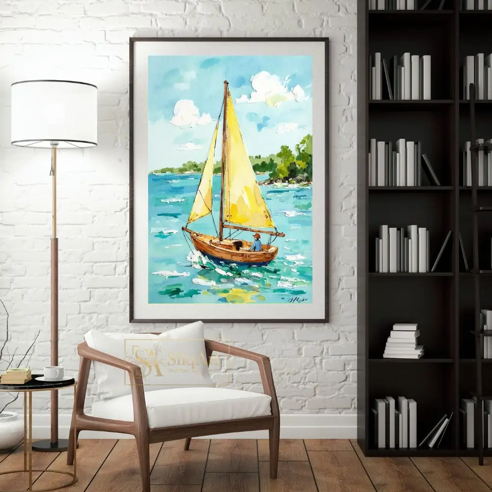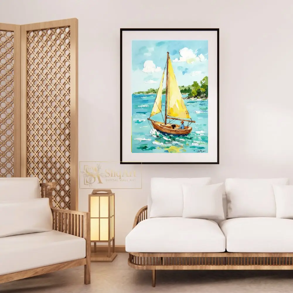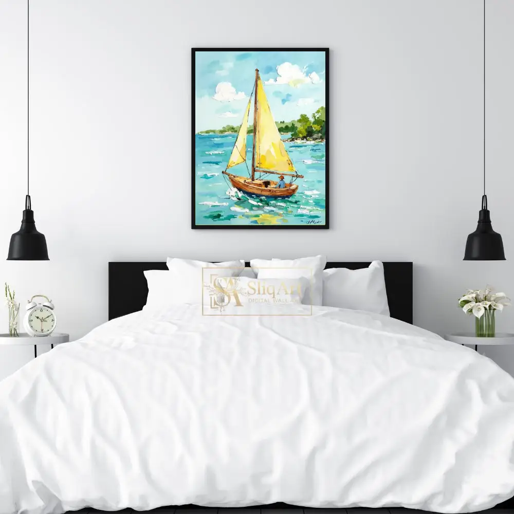 Capture the spirit of nautical adventure with this stunning impressionist painting. The artwork features a classic wooden sailboat with radiant yellow sails gliding across a shimmering turquoise sea.