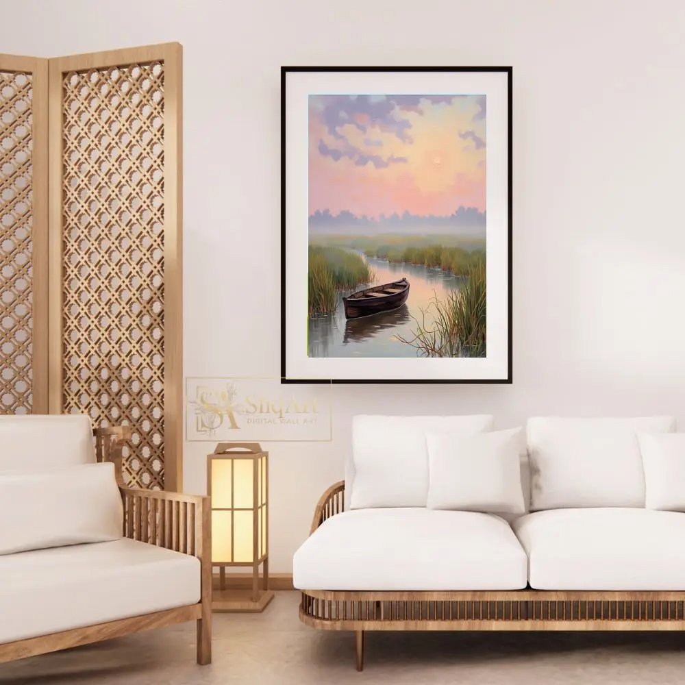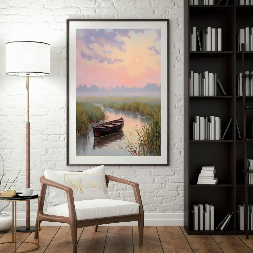 Immerse yourself in a moment of absolute tranquility with this impressionist-style digital painting. A solitary wooden rowboat floats gently on a mirror-like marsh river, surrounded by swaying tall grasses.