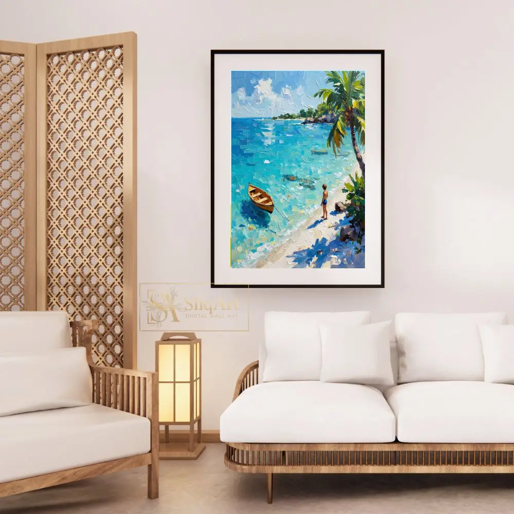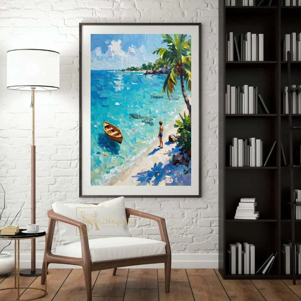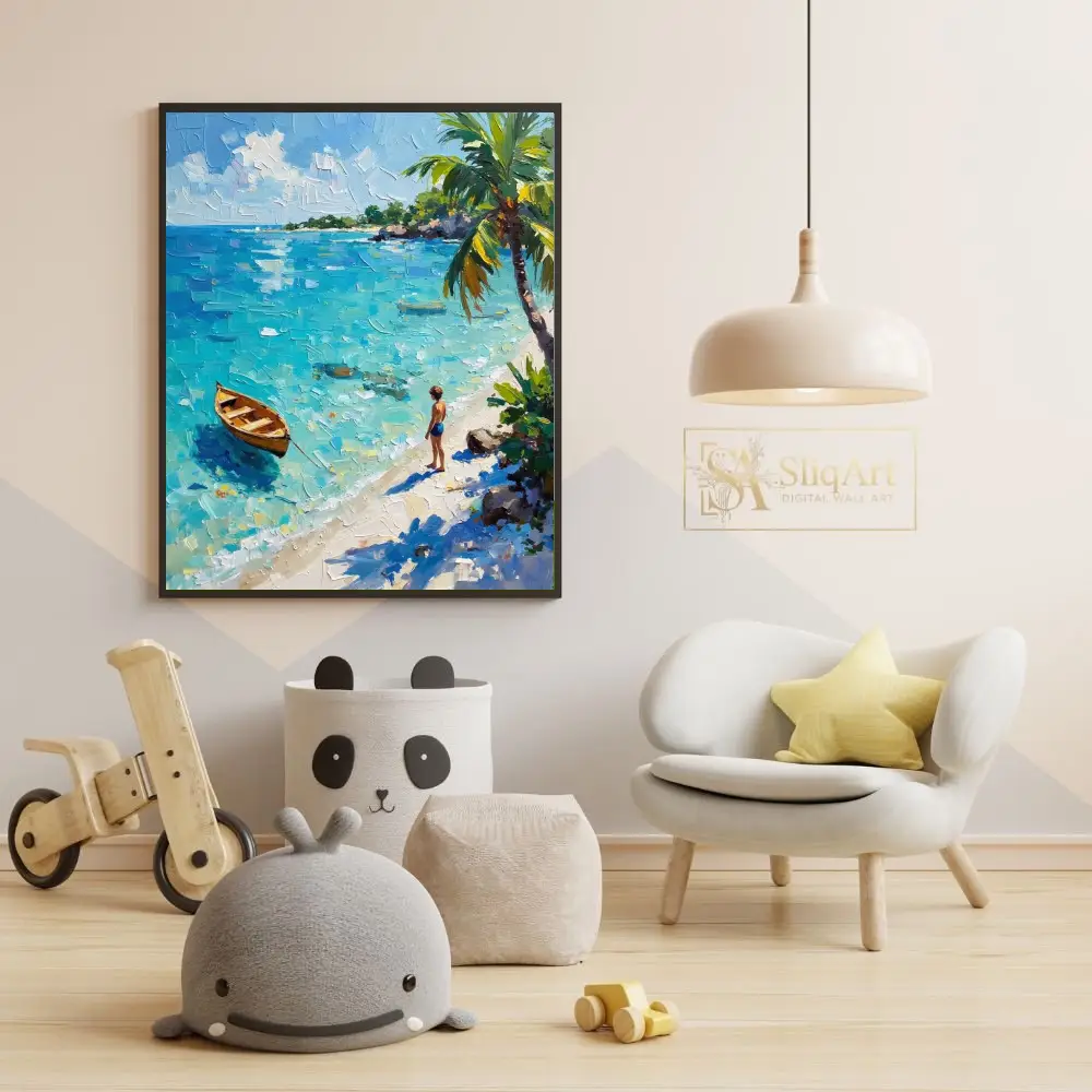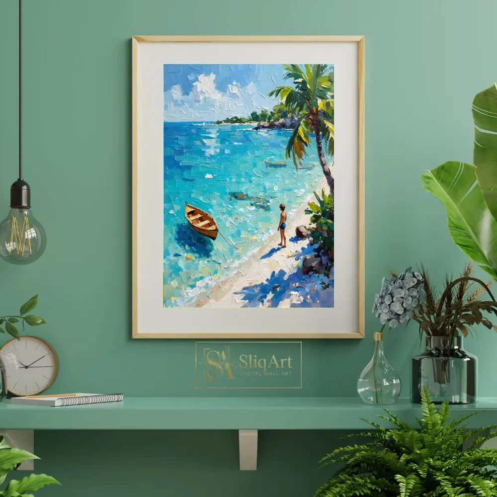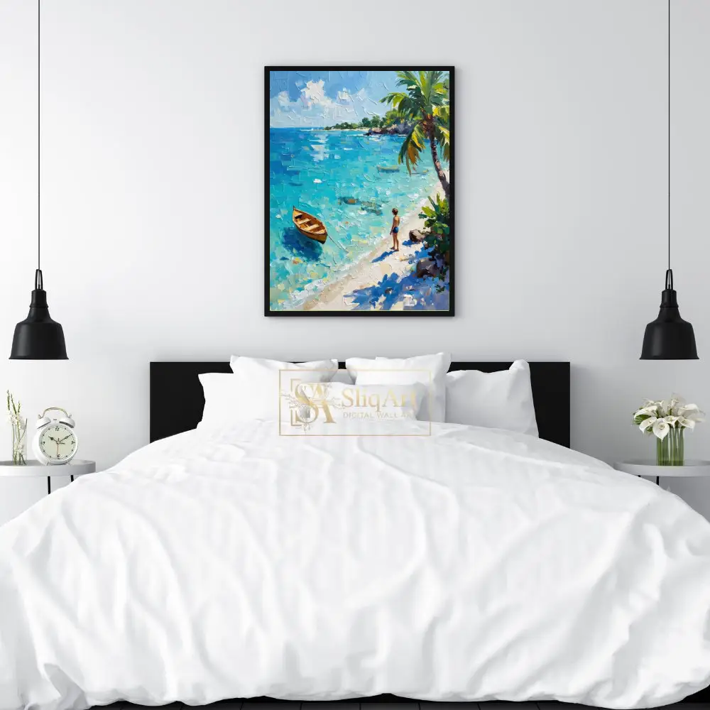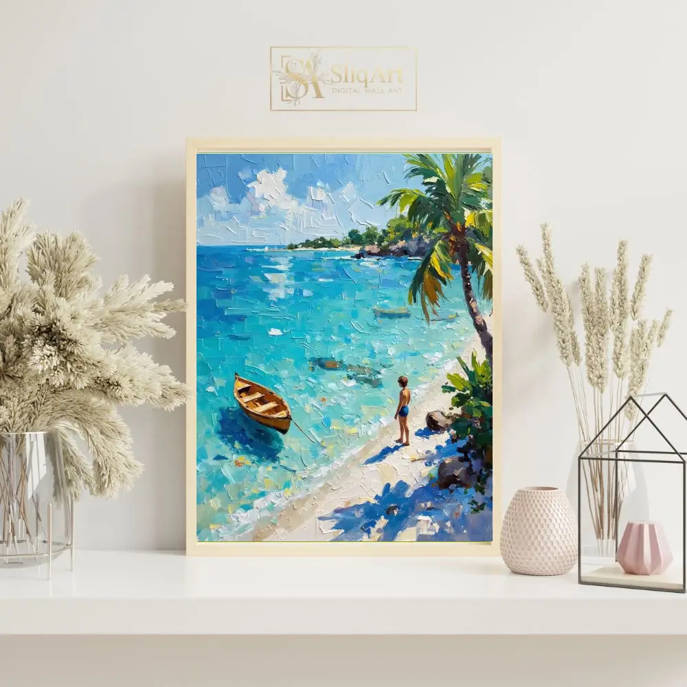 The piece features a lone wooden rowboat floating on shimmering turquoise waters, while a young figure stands on the pristine white sand beneath swaying palm trees. Captured with bold, textured palette knife strokes, the thick impasto technique brings the movement of the sea and the warmth of the tropical sun to life, offering a window into a peaceful coastal escape.