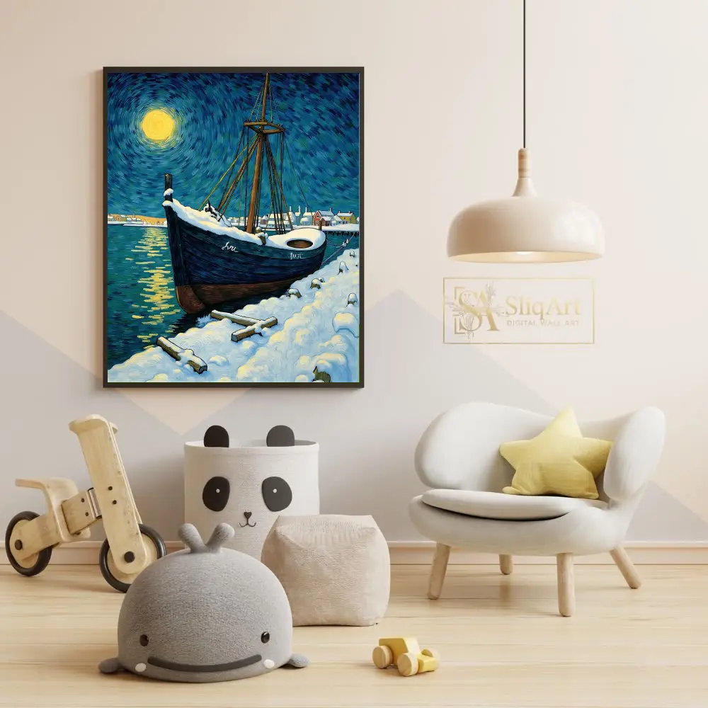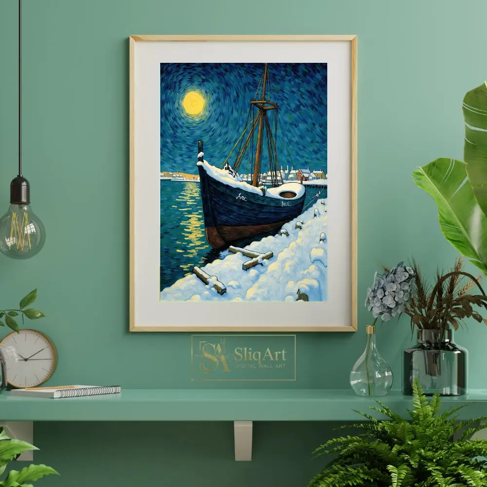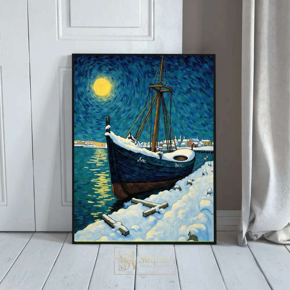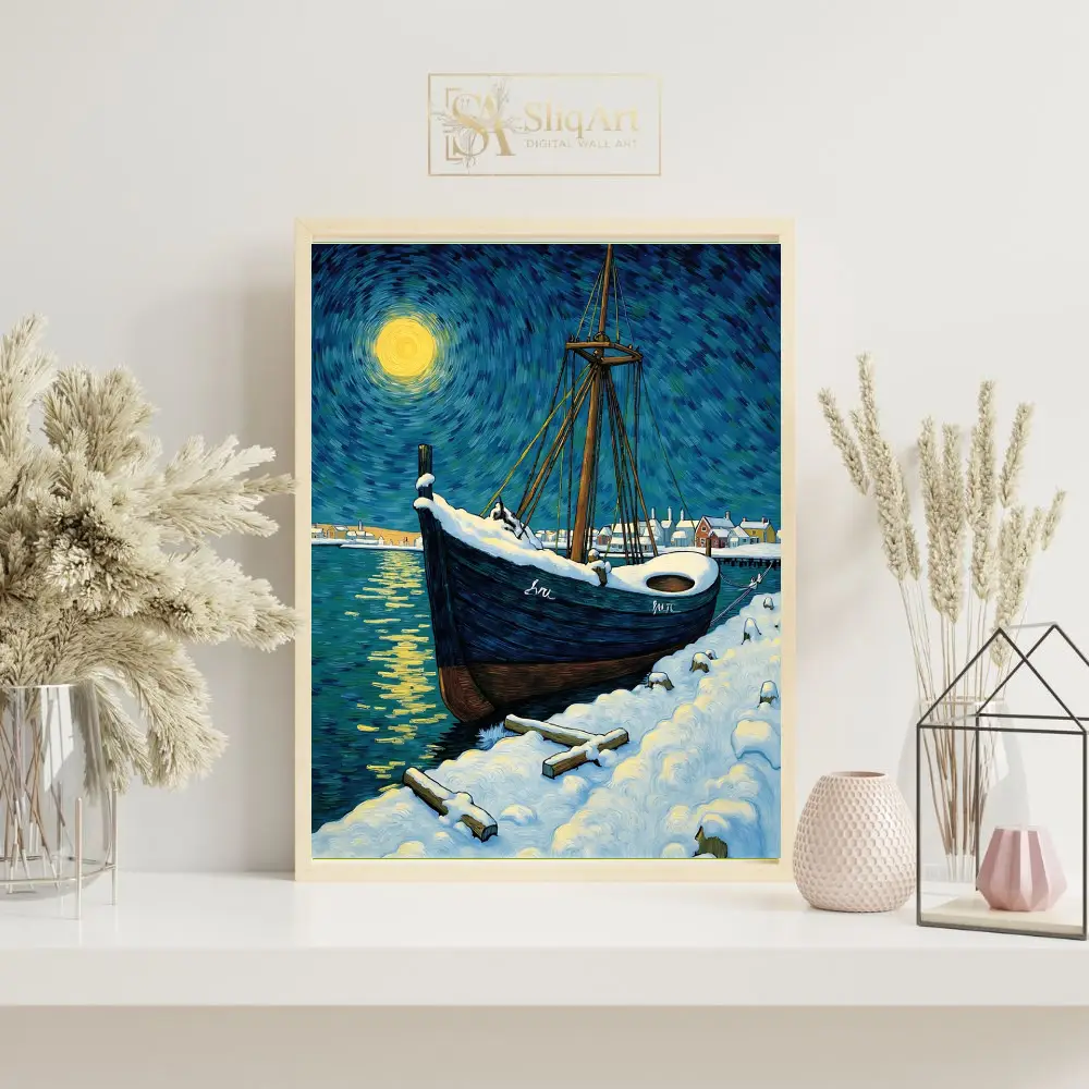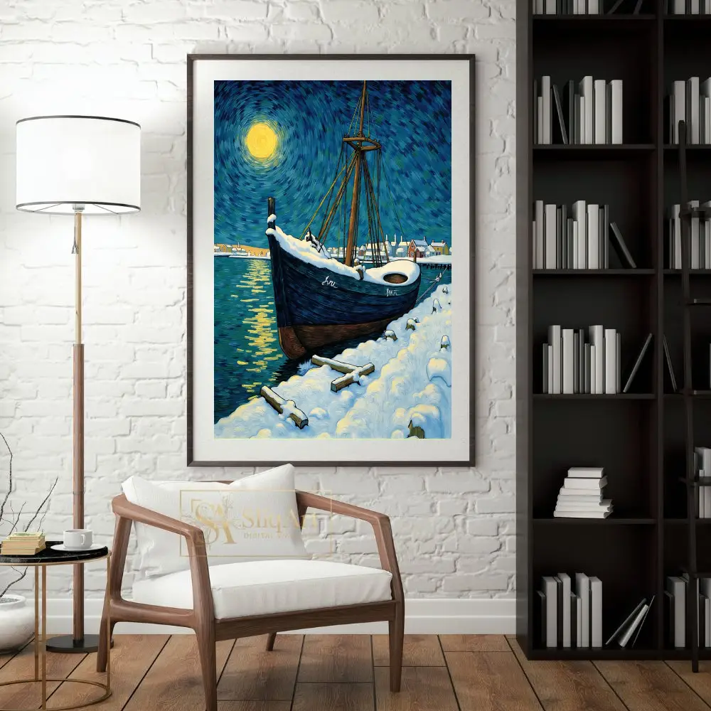 Experience the magic of a winter night with this stunning Post-Impressionist wall art. Inspired by the rhythmic, swirling brushstrokes of Vincent van Gogh, this piece depicts a snow-laden wooden boat resting quietly at a harbor’s edge.